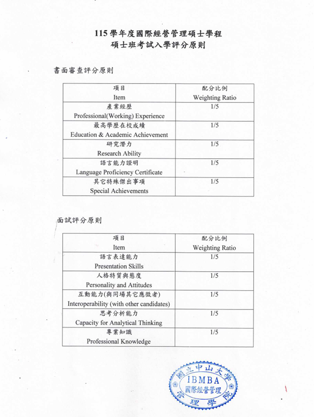 115學年度 IBMBA 考試入學書面審查、面試評分原則與重要日期提醒